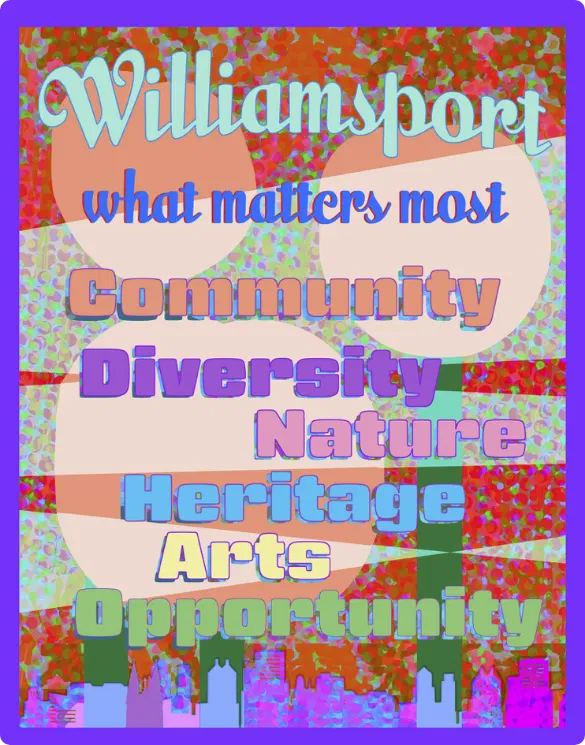 Phase three, also coordinated by Factory Works in partnership with Lycoming Arts, Heart of Williamsport, and with assistance from the Williamsport Business Association, is the What Matters Most public art project. Brian Spies, a local artist, was commissioned to craft a design that creatively visualizes the eight HOW Heart and Soul Statements. Posted in stores throughout Williamsport and displayed in the kiosks at the William Street entrance to the Trade and Transit Plaza II, the image portrays the vitality of the city and the heartfelt statements of its residents.